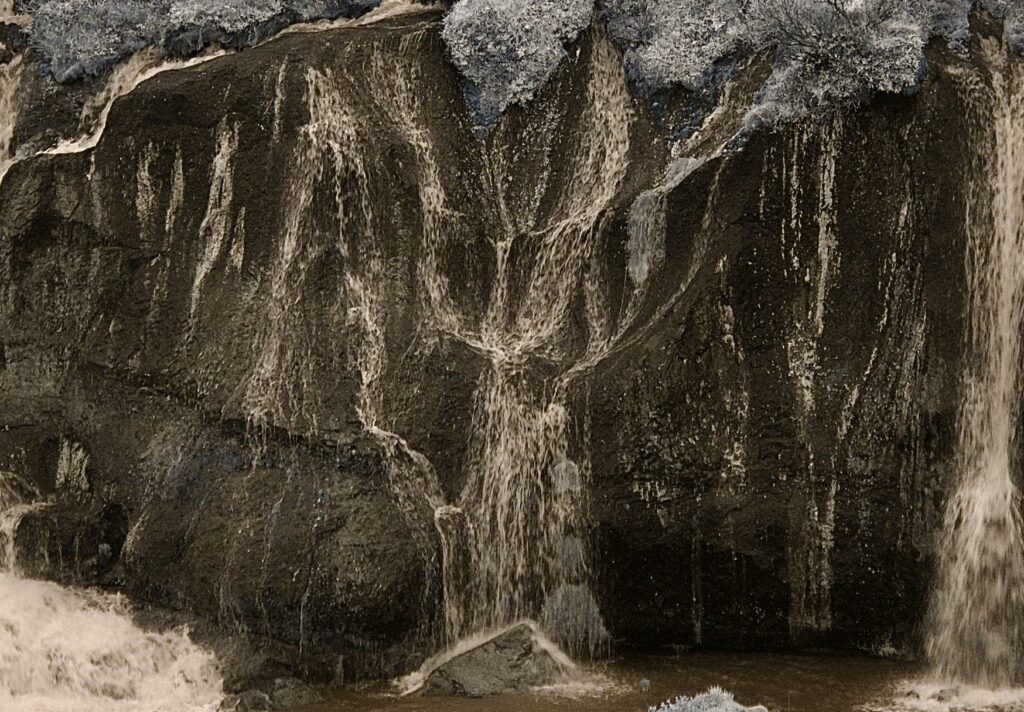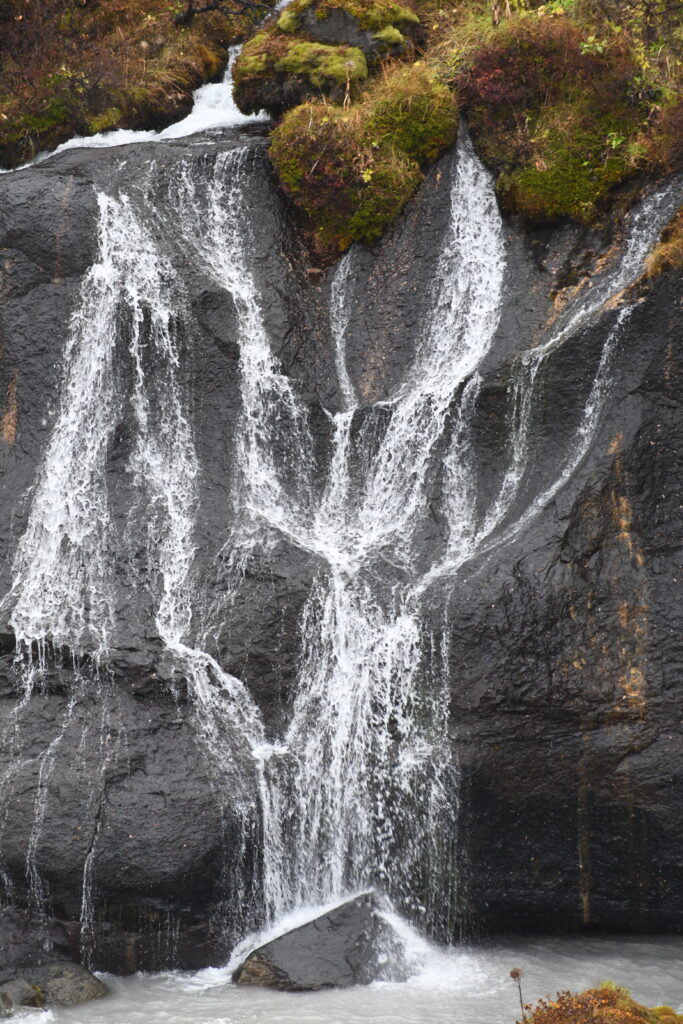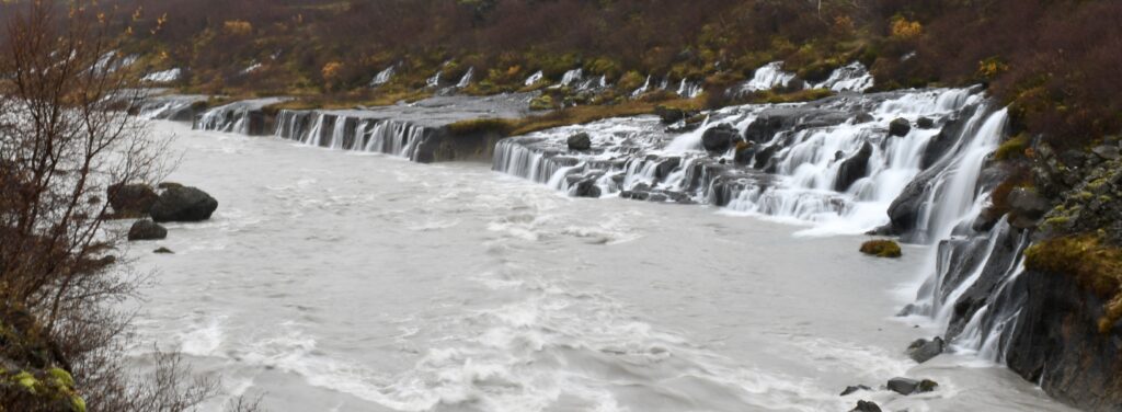 Drizzle, a totally grey sky and a difficult waterfall to photograph was the first assignment. This at Hraunfossar.